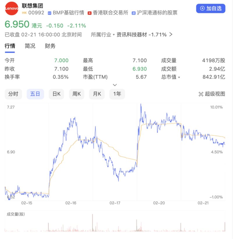 截至2023年2月17日收盘,联想集团(00992.HK)报收于6.78港元,下跌3.14%,换手率0.64%,成交量7728.65万股,成交额5.29亿港元,不过随后几天有所反弹。