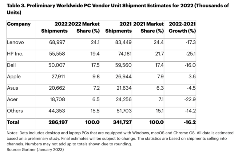 Gartner数据显示,2022年第四季度全球PC出货量为6530万台,与去年同期相比下降28.5%, 2022年全年PC出货量达2.862亿台,同比下降16.2%。创下了史上年出货量最大的下滑幅度。