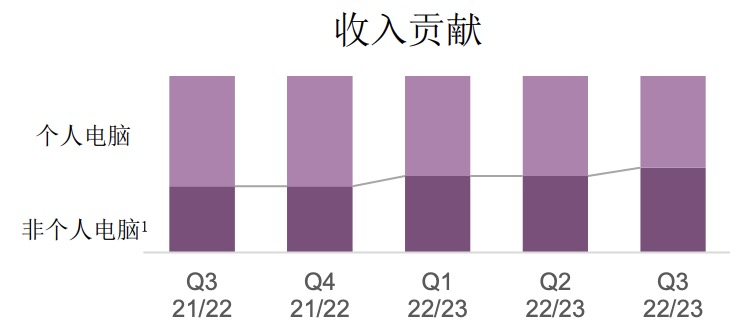 其实,从联想的2022-2023年前三季度各季度财报数据中可窥见,个人电脑尽管仍为支柱业务,但其所占营收比重逐渐缩少,由63%降至59%,同时也导致IDG业务部门业绩下滑。